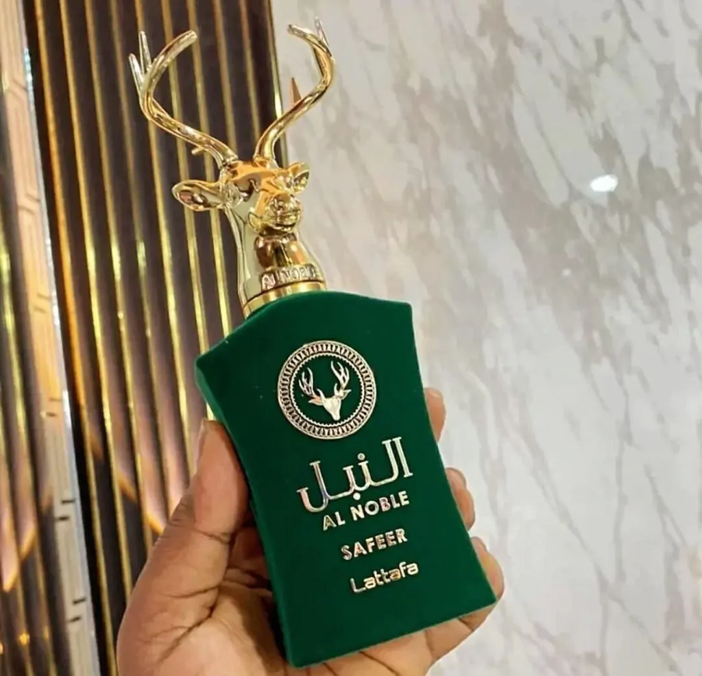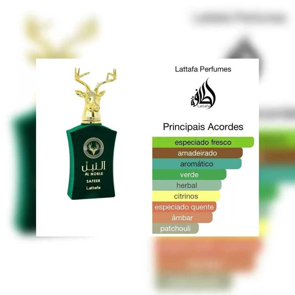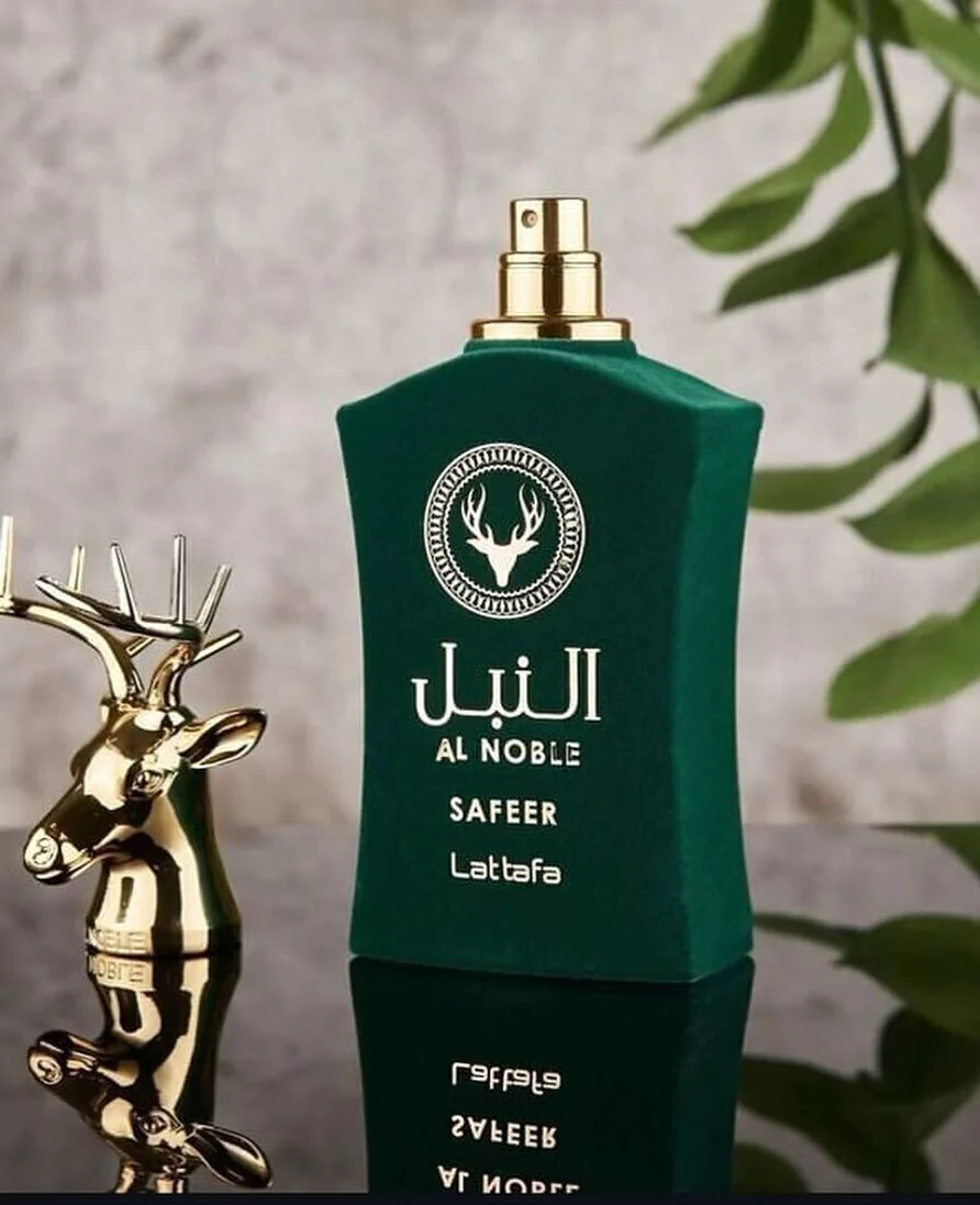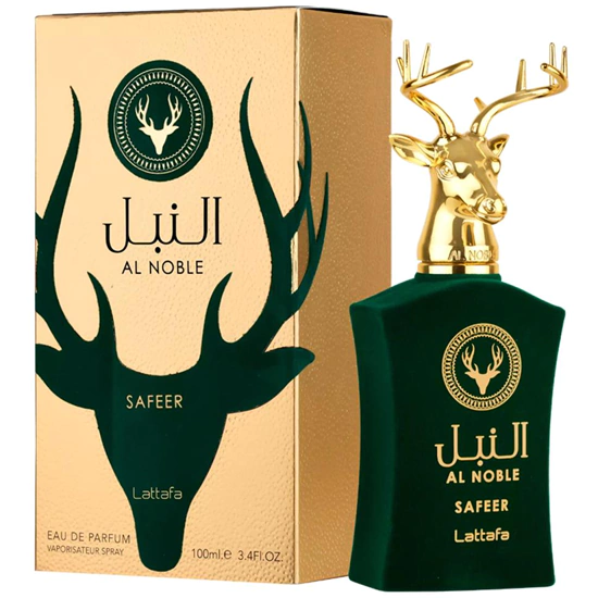 A base é terrosa, resinosa e amadeirada com noz de tigre, ládano, cominho, patchouli, olíbano, zimbro e madeira guaiac. Safeer Al Noble é uma fragrância clássica e alegre que se adapta a qualquer ocasião.