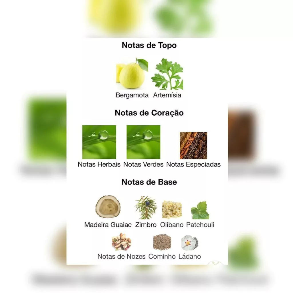 Notas de Corpo: Notas Herbais, Notas Verdes e Notas Especiadas.
