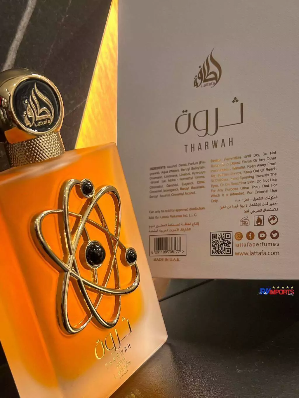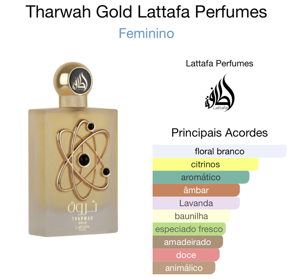 Tharwah Gold de Lattafa Perfumes é um perfume Âmbar Floral Feminino. É uma fragrância cristalizada com toques sutis de aromas florais herdados do jasmim, lavanda e flor de laranjeira, o começo é principalmente doce, seguido por um doce floral e uma secagem de doçura quente.